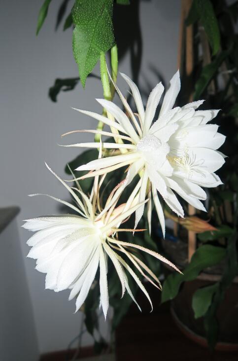 浸浴在月光下,昙花轻轻颤动着,就像可爱的小精灵轻轻地起舞。她要开花了,她的花筒慢慢卷起,绛紫色的外衣慢慢打开。这一刻,风儿忘记了舞动,鸟儿忘记了歌唱,星星忘记了眨眼。他们屏起呼吸,等待着目睹昙花开放后美丽。终于,在全世界地注视下,昙花展露出她一生最美的姿态。